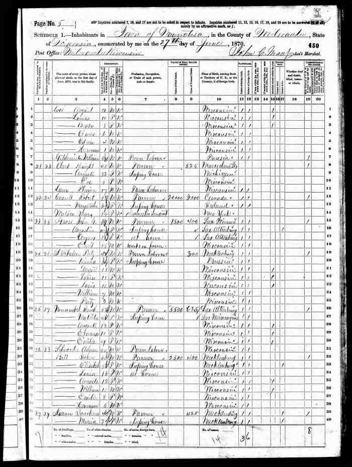 1870 Census: Wauwatosa, Milwaukee, Wisconsin, USA, "Florian Lauer, age 17, farm labourer, single, b. Wisconsin, in home of Dwight Clark & Augusta Clark"